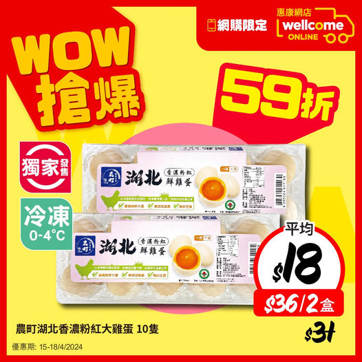 依家嚟惠康網店只需低至59折-只需$36/2盒,平均$18/盒就買到農町湖北香濃粉紅大蛋10隻裝!😋快啲嚟惠康網店搶購啦,賣晒就冇㗎啦🛒🛍️