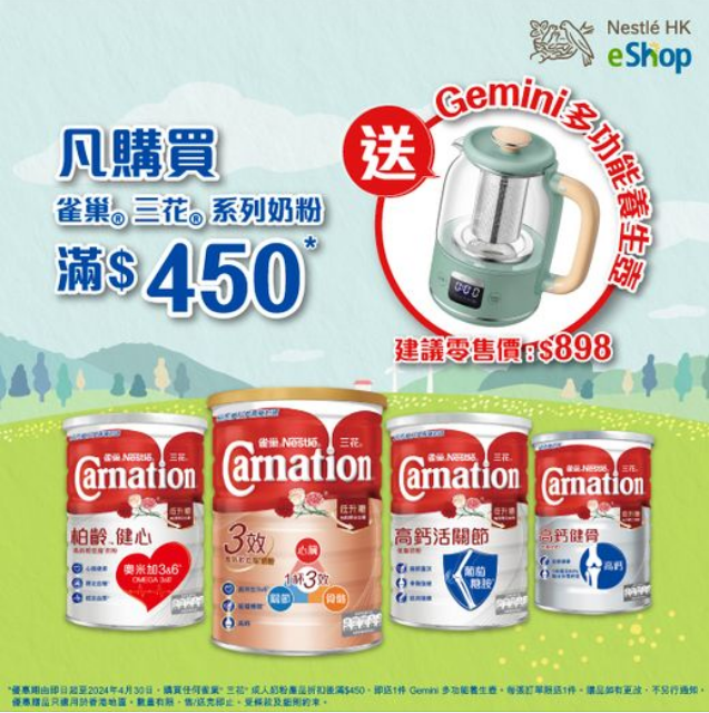 。宜家只要你喺雀巢香港eShop購買雀巢® 三花® 成人奶粉,折扣後滿$450,仲即刻送你實用嘅 Gemini多功能養生壺 一個*