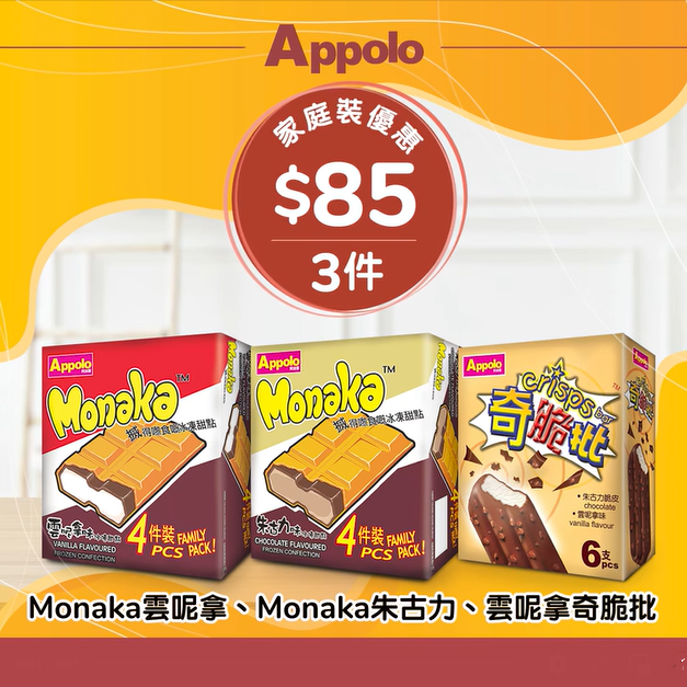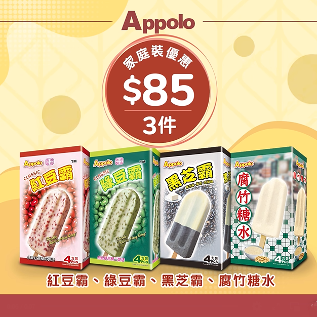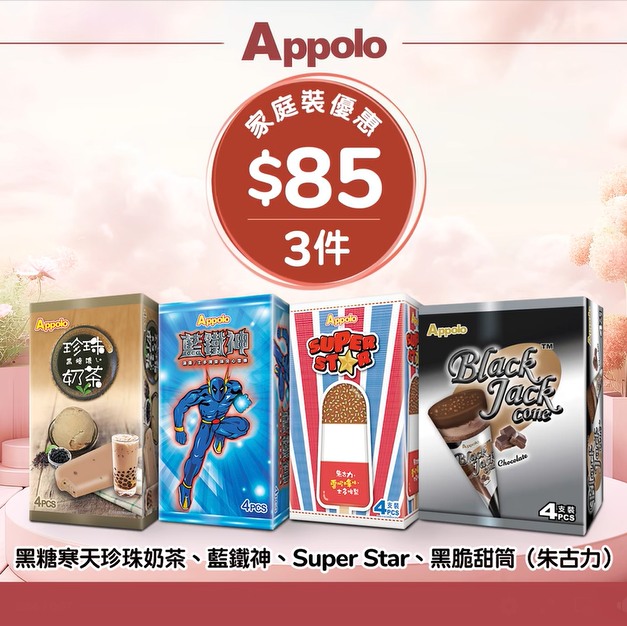 【清涼消暑之選】嘩嘩嘩!踏入5月,雖然你同我未必可以享有5.1黃金週嘅長假期,但夏天正式到來,食住阿波羅嘅家庭裝雪糕/雪條產品,一樣可以同家人朋友暢享周末! 今個星期,多款家庭裝雪糕、雪條、甜筒同Monaka都只售$85/3件!今次優惠由經典口味、日/台風味到人氣港式糖水系列都有,梗有一款咁你心水!千祈唔好手軟,即刻為你屋企個冰箱補貨啦優惠期由即日起至5月5日。#Appolo #阿波羅雪糕 #雪糕 #雪條 #優惠 #hongkongfood #Monaka #紅豆霸 #黑芝霸 #綠豆霸 #藍鐵神 #黑糖寒天珍珠奶茶條 #Super Star #奇脆批 #腐竹糖水條 #黑脆甜筒朱古力