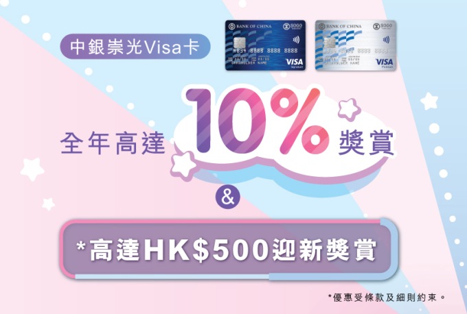• 中銀崇光Visa Signature卡專享手機支付額外5%現金回贈