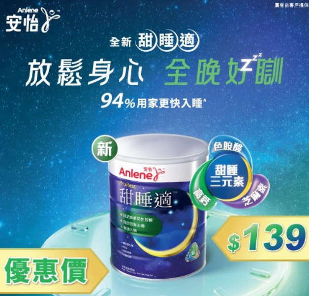 ^安怡補充資料: 48名受訪者連續飲用甜睡適™2星期後自我評估。效果因人而異。2023年香港安怡市場調查。每杯安怡甜睡適含13.5毫克芝麻素及90毫克色胺酸。需配合均衡飲食及適量運動