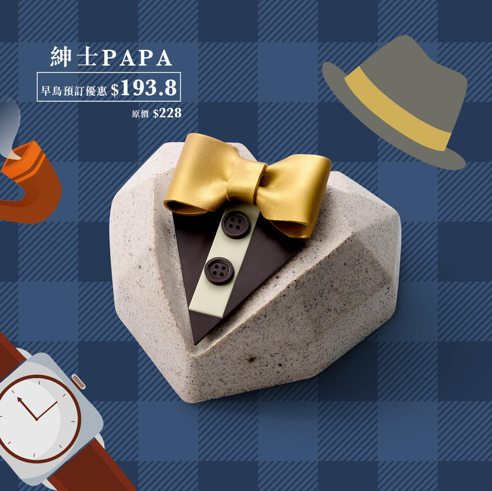🎩 #紳士PAPA 煲呔西裝造型展現爸爸 charm 爆一面!蛋糕以曲奇牛奶慕斯口味包裹住朱古力蛋糕,夾層更有朱古力脆珠,多重口感包保爸爸食到舔舔脷😋!
