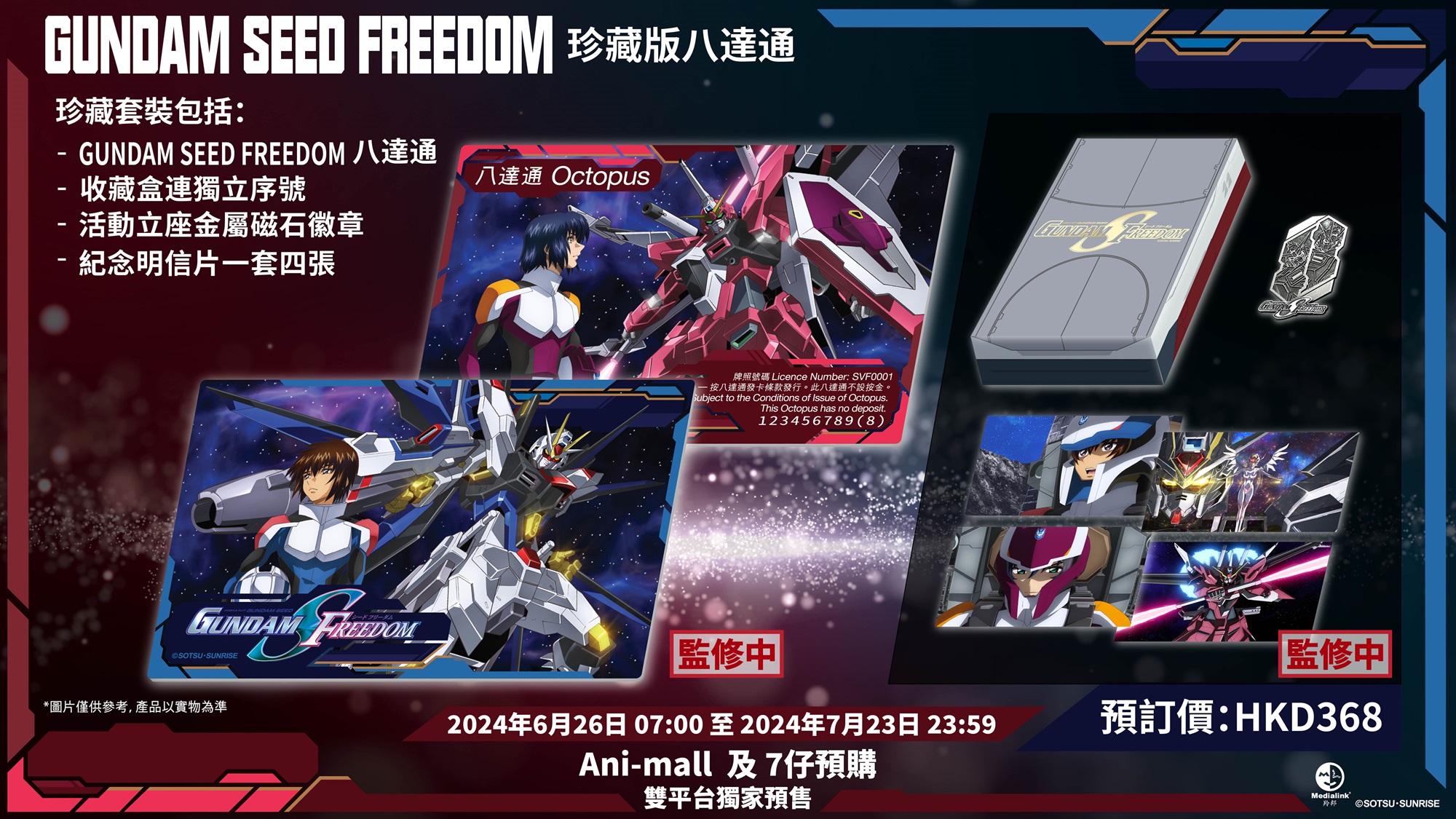 SEED FREEDOM》特別版八達通紀念珍藏套裝,以兩位主角基拉及阿斯蘭為設計主軸,以前、後兩面分別展示他們駕駛的「突擊自由高達貳式」及「無限正義高達貳式」,重溫經典的愛與戰火故事!
