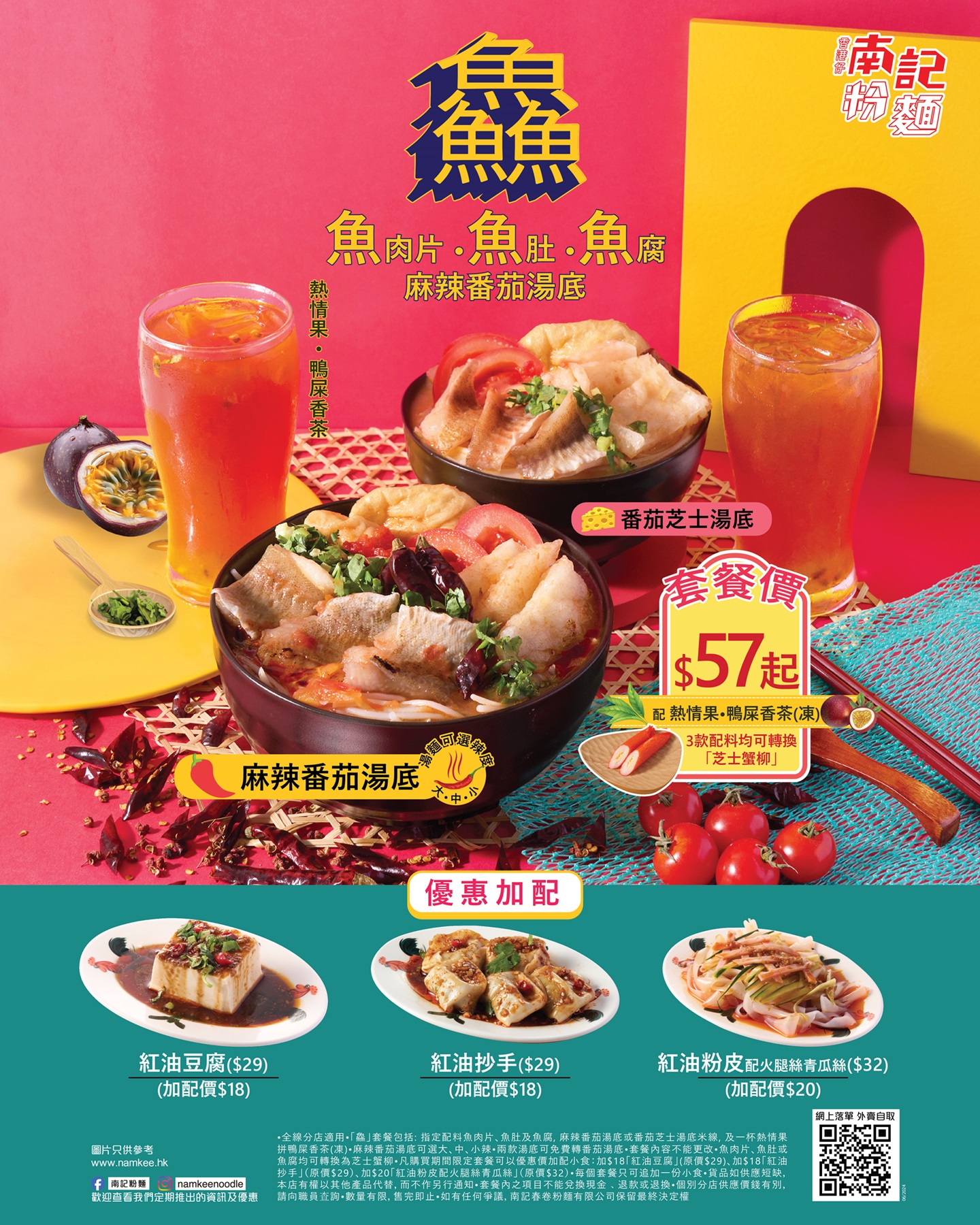 香港人喜歡嚐鮮,食嘢除了要有新鮮感、食材當然都要夠「鱻」(音鮮)。今個夏天,“香港仔”南記粉麵首度推出「鱻」米線套餐,鮮味澎湃的味覺盛宴以三大「魚魚魚」食材為首:肉白紮實的魚肉片、索湯魚肚和綿滑魚腐入饌,配搭椒麻鮮香的「麻辣番茄湯底」或是全新推出奶香味濃「番茄芝士湯底」,最後暢飲一杯降辣解膩的南國風熱情果.鴨屎香茶,瞬間回復清爽!