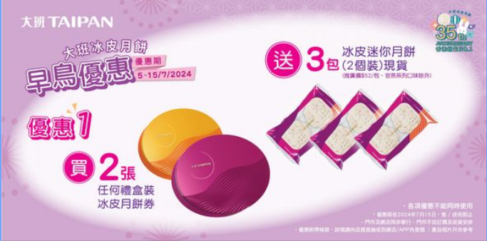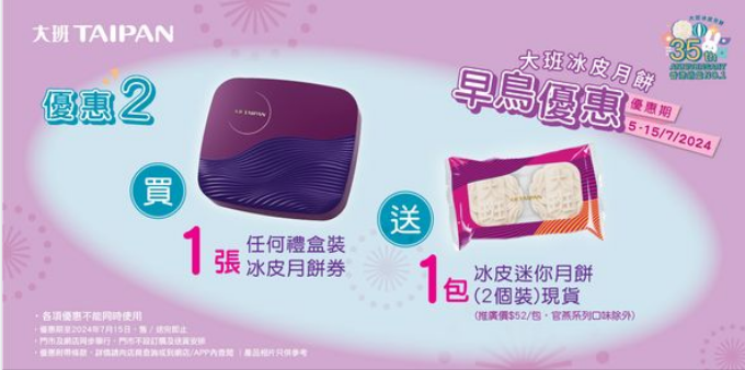 香港銷量No.1大班冰皮月餅推出限時早鳥優惠,由即日起至2024年7月15日,購買禮盒裝冰皮月餅券即享超級著數優惠