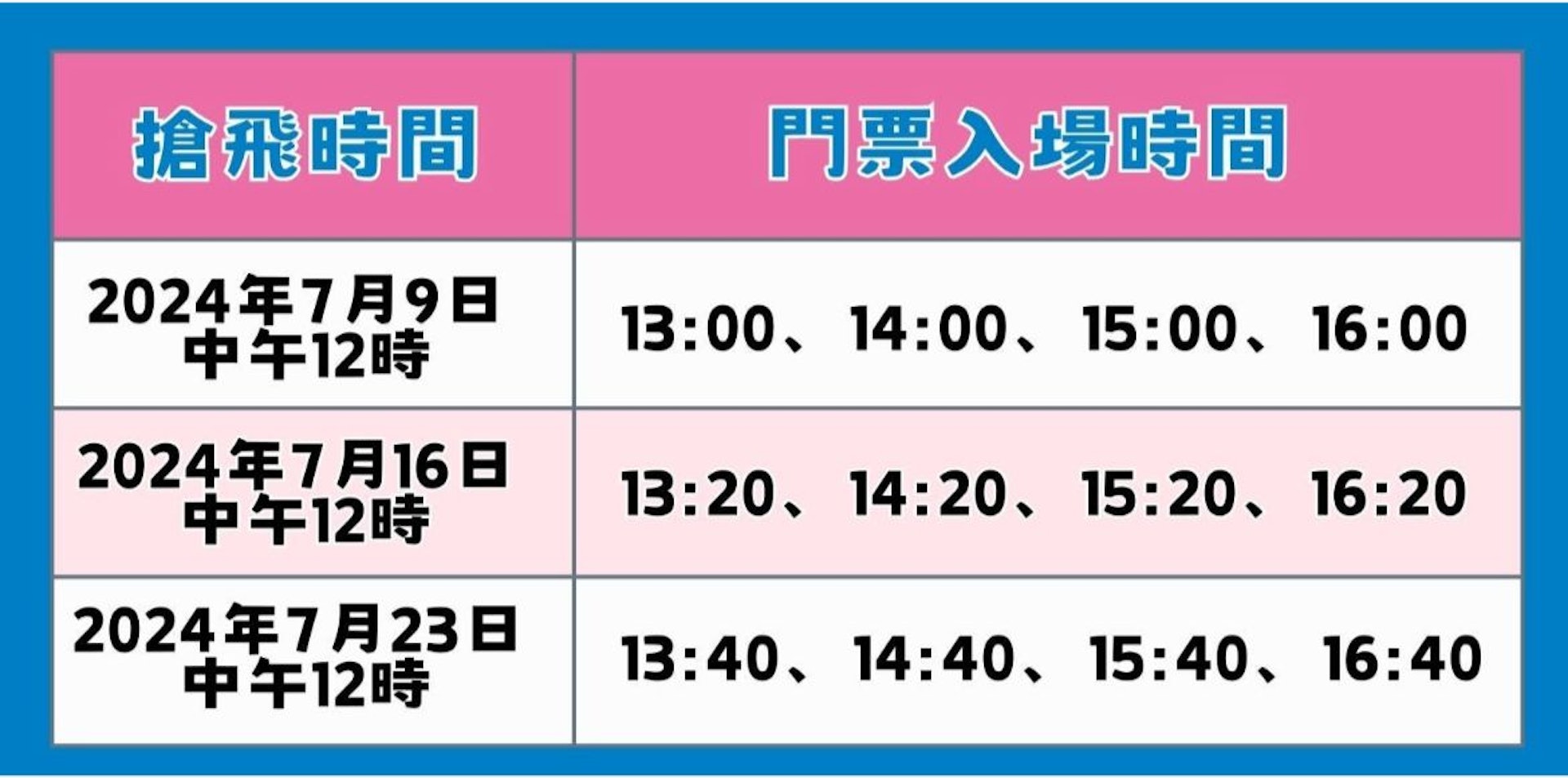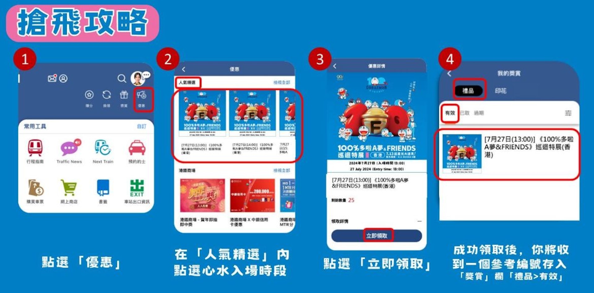 如果想搶到免費飛,MTR Mobile登記用戶可於7月9日、7月16日、7月23日中午12時起進入搶票頁面進行搶票,額滿即止。這次活動合共提供了300套門票,適用於7月27日其中12個指定下午時段進入收費展區,同時包含一般門票隨機附贈的多啦A夢特別造型徽章。每位成功搶飛用戶,亦會收到兩張同一時段的電子門票。
