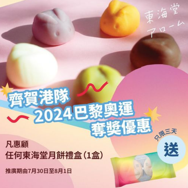 【 齊賀港隊2024 巴黎奧運奪奬優惠 】好消息! 真是讓人興奮又刺激! 恭喜港隊獲得佳績!為與大家一齊同慶同樂,凡選購任何東海堂アローム月餅禮盒,即可獲得冰兔冰皮二人前 1包(零售價$62)! 趕快到東海堂 アローム各分店選購,獲取喜悅吧! *優惠期由2024年7月30日至8月1日 ;購買月餅禮券或現貨均可享有此優惠;冰皮2人前不可計算購買數量;大戶價購買月餅不可享有此優惠;東海堂禮餅券換購須以零售價計算;現金券不適用;不可與其他優惠同時使用;數量有限,售完即止;產品圖片只供參考;詳情請向店員查詢