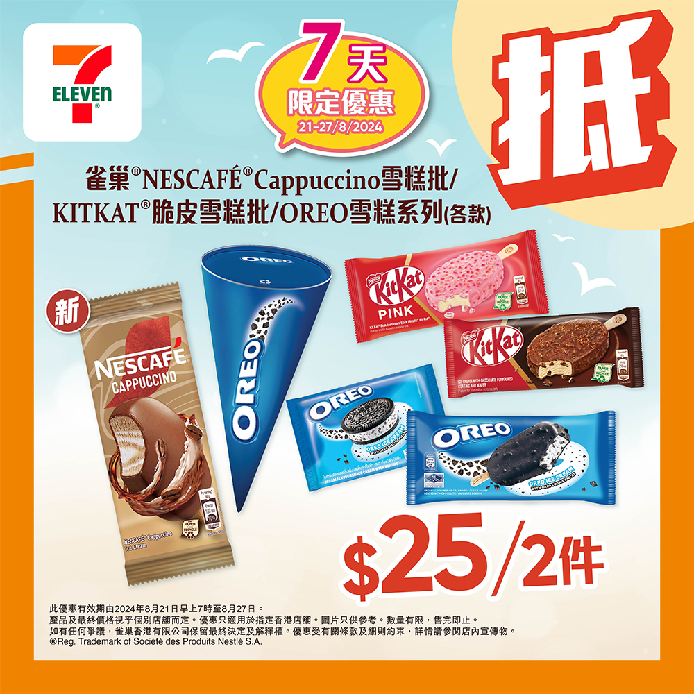 由即日至8月27日,嚟7仔只需$25就買到2件NESCAFÉ Cappuccino 雪糕批/KITKAT 脆皮雪糕批/OREO雪糕系列,平均每件都只係$12.5