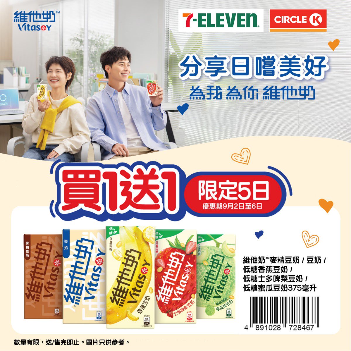 維他奶分享日嚐美好 便利店優惠去7-11/ Circle K便利店出示以下電子優惠券即可享維他奶豆奶系列375毫升買一送一優惠!https://www.vitavitasoy.com/tc/promotion/維他奶分享日嚐美好限時優惠