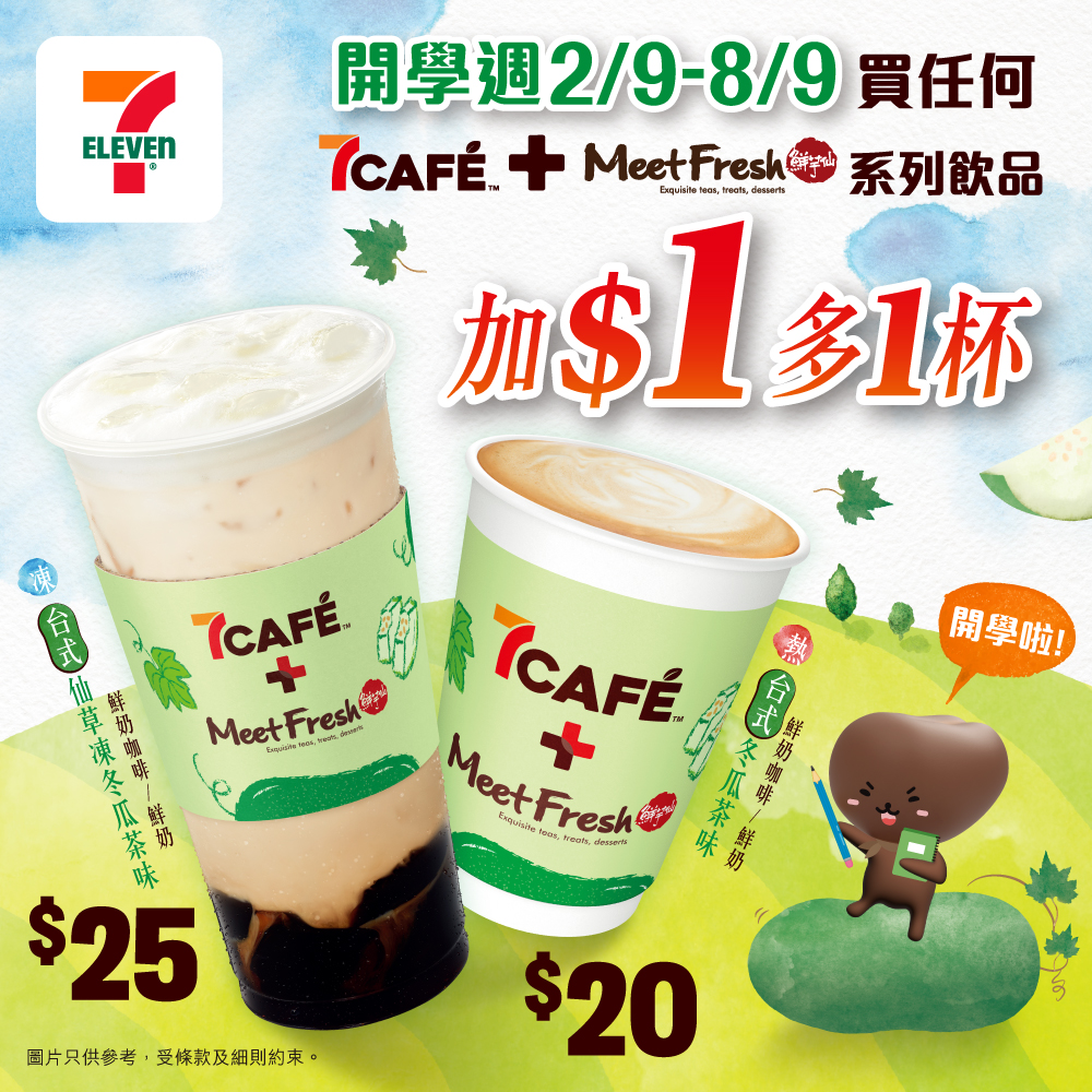 ^於有效期內購買7CAFÉ+鮮芋仙系列飲品,即享加$1多一杯優惠,熱飲($20)/凍飲($25)均可。有效期由2024年9月2日早上7時至2024年9月8日。此優惠只適用於同等價錢之產品,每購買一杯只可享加購優惠一次,並不可與其他優惠同時使用。貨品圖片只供參考。優惠受條款及細則約束,詳情請參閲店内宣傳品。