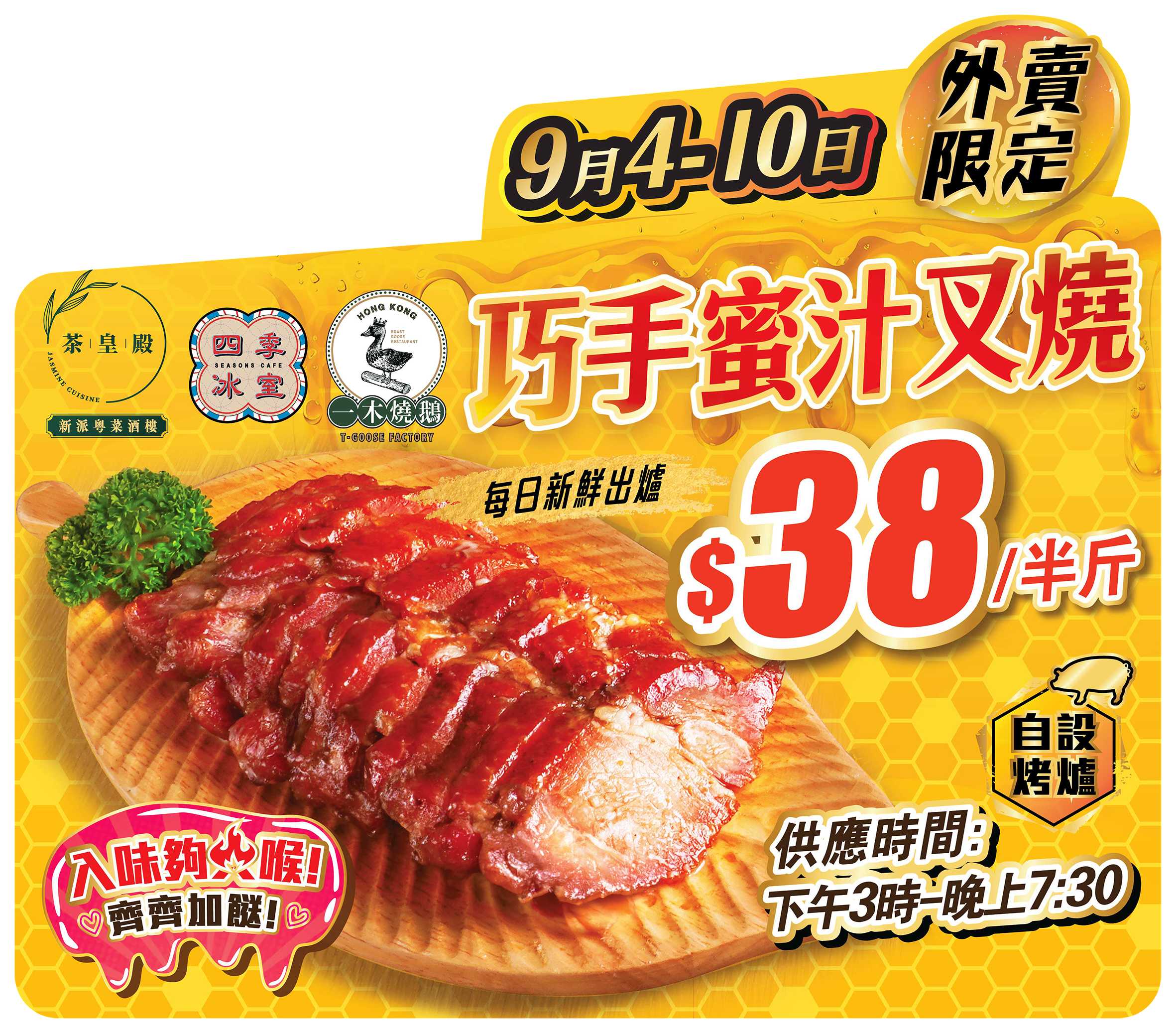 由 9 月 4 日至 10 日推出一星期限時外賣$38/半斤叉燒優惠,於 12 間酒樓及冰室品牌供應,包括:茶皇殿、四季冰室及一木燒鵝,供應時間為下午 3 點至晚上 7 時半。