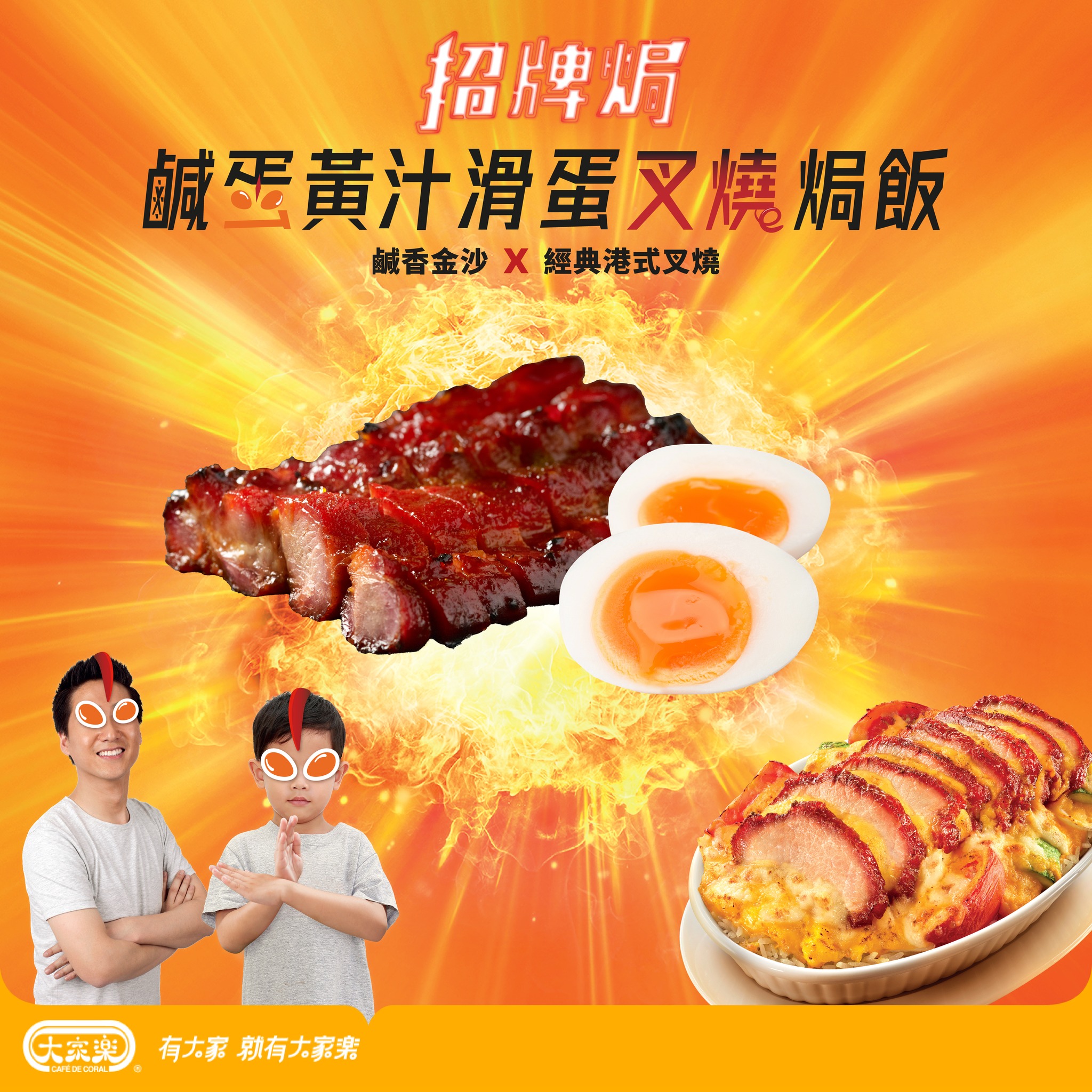 大家樂招牌焗將鹹蛋黃汁滑蛋叉燒焗飯帶返嚟!香噴噴嘅經典港式叉燒焦香肉嫩,加埋秘製金黃鹹蛋黃汁,入口鹹香惹味
