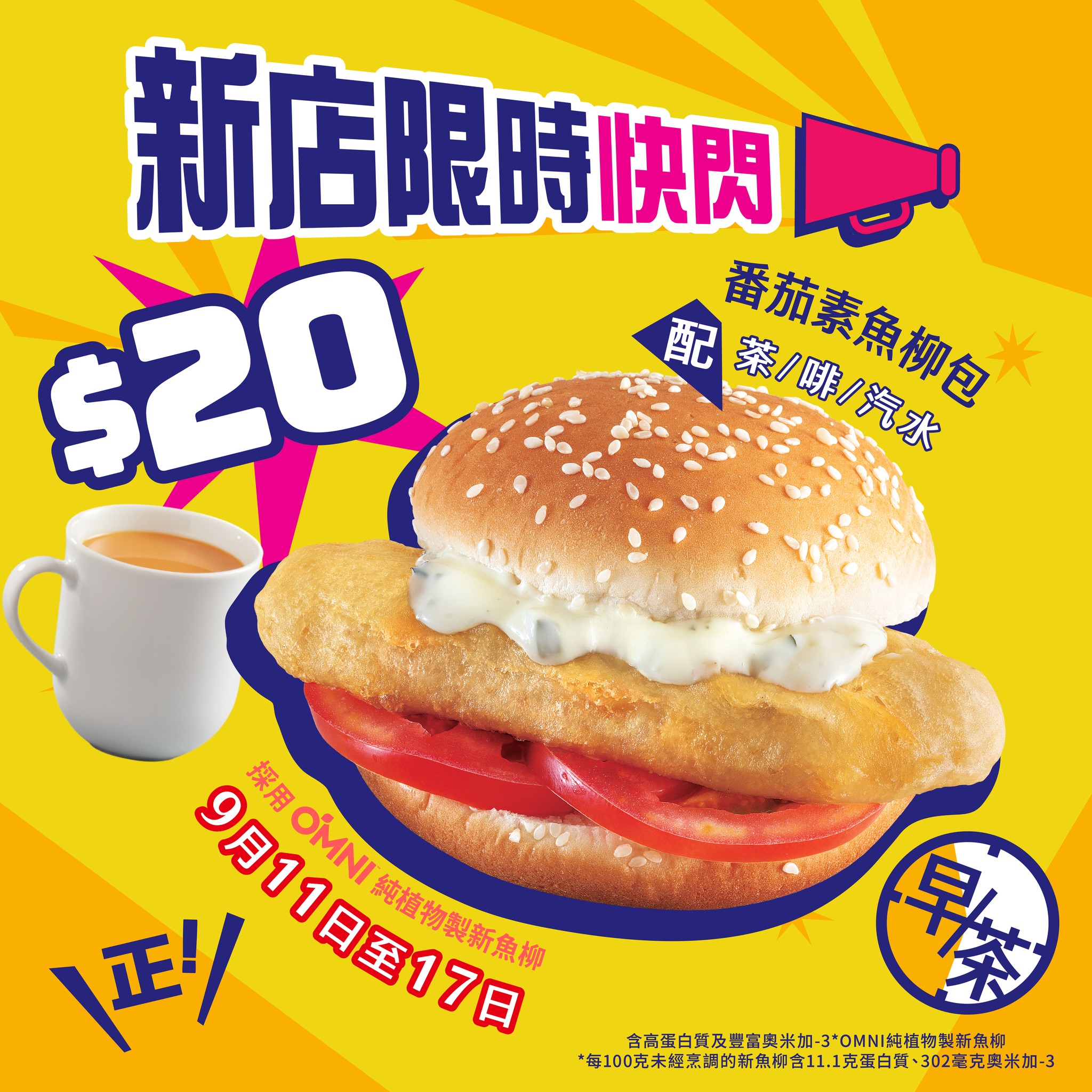 !早/茶市時段用$20即嘆番茄素魚柳包配茶/啡/汽水,優惠期由即日至9月17號