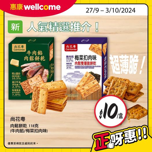【精選推介:尚花粵肉鬆餅乾新登場!】最近零食有咩推介?尚花粵有好介紹!全新登場牛肉餡肉鬆餅乾同埋梅菜扣肉味肉鬆餅乾;牛肉餡同肉鬆完美配合,加上超薄脆餅乾,咸香味十足,好食到一啖接一啖!梅菜扣肉味,梅菜嘅鮮香配上肉鬆嘅肉香,同樣配上超薄脆餅乾,非常好食!依家嚟惠康買全新上架嘅2款肉鬆餅乾(118克)都只係$10/盒!快啲買嚟試下啦!優惠期:27/9 - 3/10/2024此優惠適用於惠康網店/Market Place網店/yuu網購。以單一發票及折實價計算。貨品數量有限,售完即止。部分貨品只限指定分店提供。優惠受條款及細則約束。貨品圖片只供參考。