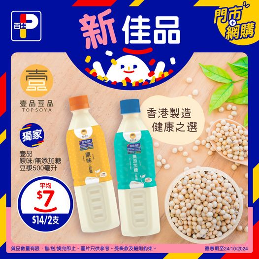 !*優惠期至24/10/2024。以上優惠適用於大部分香港百佳、FUSION、TASTE、INTERNATIONAL及PNS網購有售,並不適用於百佳旗下的其他超市品牌、數碼港商場3樓及新鮮食品優惠並不適用於TASTE x FRESH 新鮮生活之店舖。貨品數量有限,售/送/換完即止。圖片只供參考。 受條款及細則約束。# 贈品/換購品除外。以每張發票計算,並只可享用個別優惠一次。
