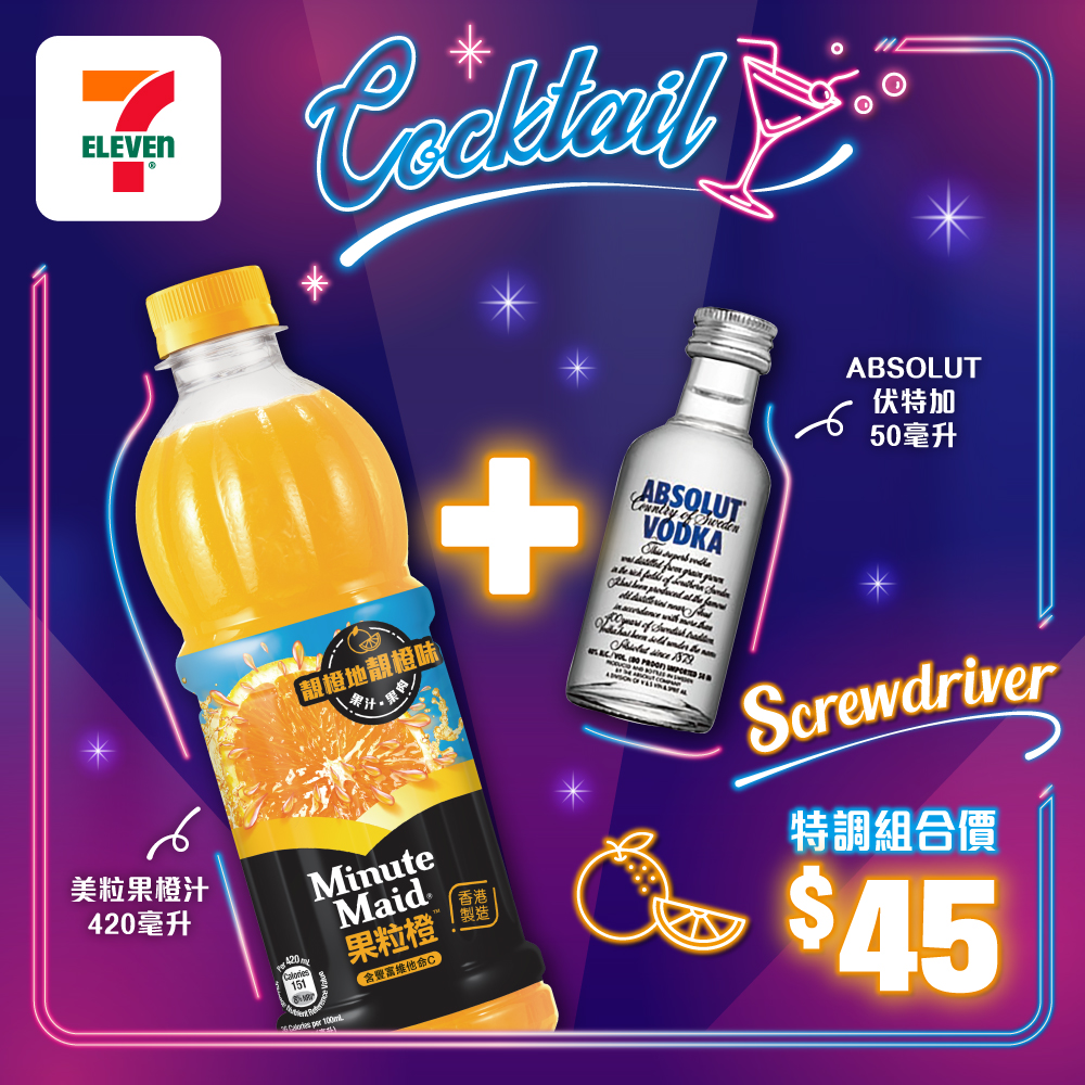 #7ElevenHK #7Eleven便利店 #快啲嚟7仔啦 #7仔ChillNight #限時特調酒組合 #特調酒 #Screwdriver #ABSOLUT純伏特加酒 #美粒果橙汁 #Cocktail #DIY