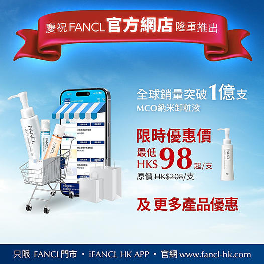 為慶祝FANCL官方網店隆重推出及MCO納米卸粧液全球熱賣超過1億支,限時優惠低至HK$98/支起,仲有各式各樣產品優惠,千祈唔好錯過