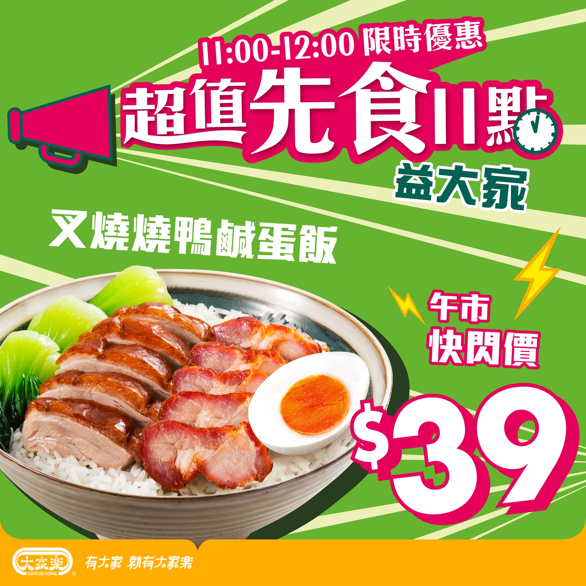 大家樂一直都了解你想點,所以大大份夠晒滿足嘅「午市先食11點」為你帶嚟─叉燒燒鴨鹹蛋飯