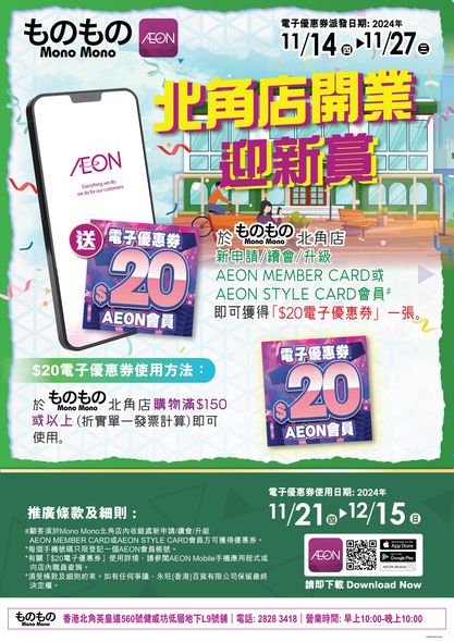 「北角店開業迎新賞」: 於Mono Mono北角店新申請/續會/升級成為AEON MEMBER CARD或AEON STYLE CARD會員即可獲得「$20電子優惠券」一張。*客人必須於Mono Mono北角店收銀處辦理新申請/續會/升級會員才能獲得優惠券。