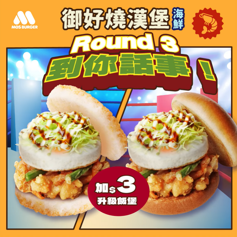 !Round 3,到你話事! 今次「御好燒漢堡(海鮮)」只要加 $3 即可升級為飯堡