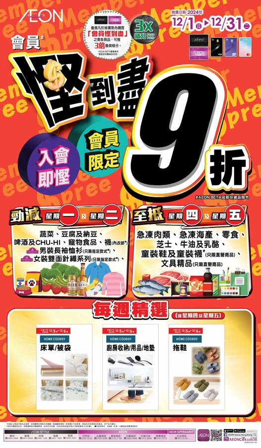 由即日至12月31日,AEON會員震撼優惠大放送。憑AEON會員卡於店內購物,多款精選商品享有9折優惠!
