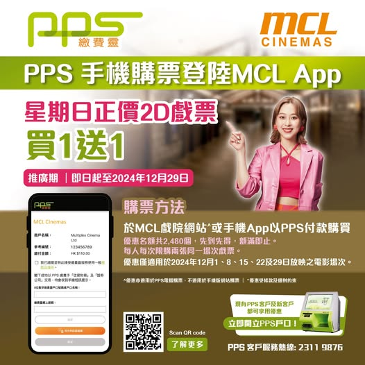 PPS手機購票登MCL App購買星期日正價2D戲票買1送1