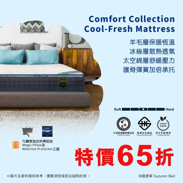 65折床褥採用Icy Fiber技術, 快速散熱減少排汗,令您擁有一個清涼乾爽舒適的睡眠。 另一面設有羊毛,冬天可以恆溫保暖,一張床褥兩種享受。