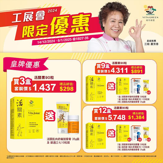 *此優惠適用於即日起至2025年1月6日,逾期無效。此優惠只適用於香港銅鑼灣維多利亞公園工展會香港維特健靈展覽攤位(1B27-35)。優惠受條款及細則約束。售或送完即止,詳情請向職員查詢。圖片只供參考。如有任何爭議,維特健靈保留最終決定權。