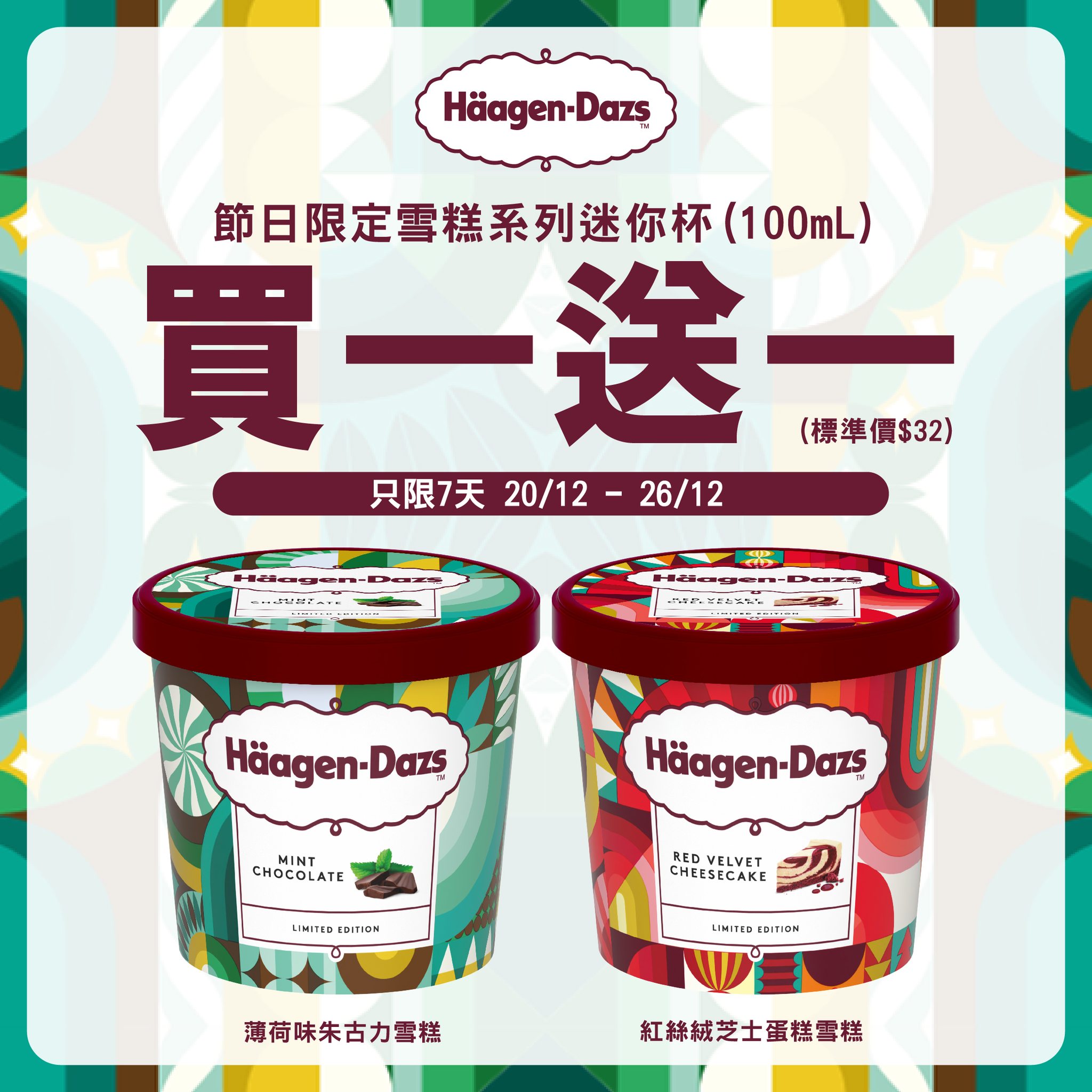 !#HaagenDazs#HaagenDazsHK#TheIceCreamOfIceCreams#LetsCelebrate#節日限定雪糕系列#限時優惠#買一送一#薄荷味朱古力雪糕#紅絲絨芝士蛋糕雪糕