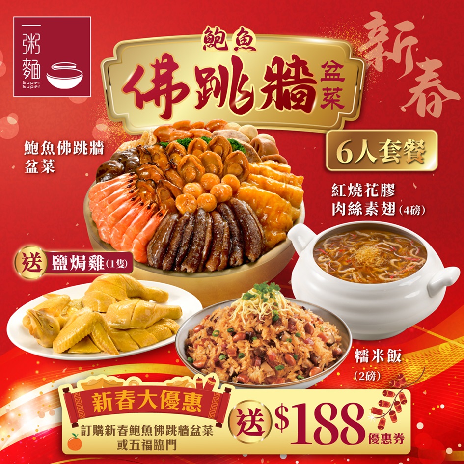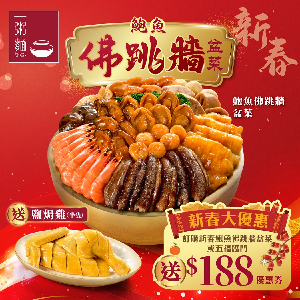 一粥麵新春「鮑魚佛跳牆盆菜」選用上等靚料,集合:十頭鮑魚、原粒瑤柱、原條海參、滑溜花膠、韓國蠔豉等名貴食材,廚師們精心製作,每年老饕們都一再回購。是次預訂新春「鮑魚佛跳牆盆菜」更加送鹹香可口的鹽焗雞!由即日起至2025年1月26日期間訂購可尊享低至七折早鳥優惠價,以優惠價HK$838享用新春「鮑魚佛跳牆盆菜」或優惠價HK$1,188帶走「鮑魚佛跳牆盆菜」套餐,更可獲$188新春優惠券,另經手機訂購更加送6罐可口可樂,令美食滋味更上一層樓。另外,透過Klook及KKday平台選購新春「鮑魚佛跳牆盆菜」6人套餐,亦可獲得總值HK$100電子優惠券,來年延續好滋味。