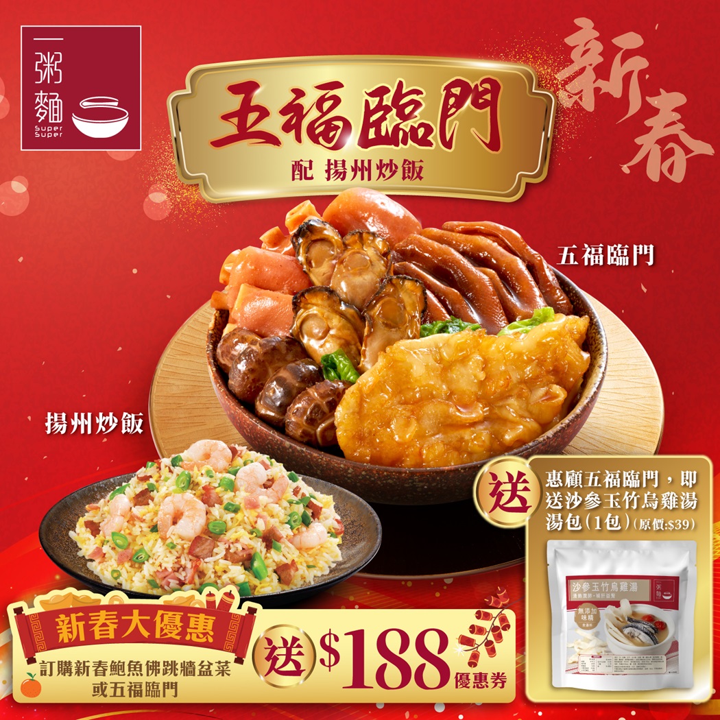 而另一「五福臨門」齊集5大尊貴食材,包括:養顏紅燒花膠、鮮味的韓國蠔豉、古法扣鴨掌、肥美南乳豬手,再配鑊氣十足揚州炒飯,滋味十足,只需HK$198,更加送沙參玉竹烏雞湯湯包(原價:$39)及$188新春優惠券,就連獎賞都有好彩頭!而2025年1月10日起五福臨門更設有堂食,各位亦都可以到一粥麵各分店品嚐。