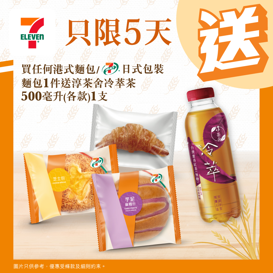 呢幾日嚟買任何港式麵包/ 7-SELECT 日式包裝麵包1件即送淳茶舍冷萃茶500毫升(各款)1支,唔洗再左揀右揀