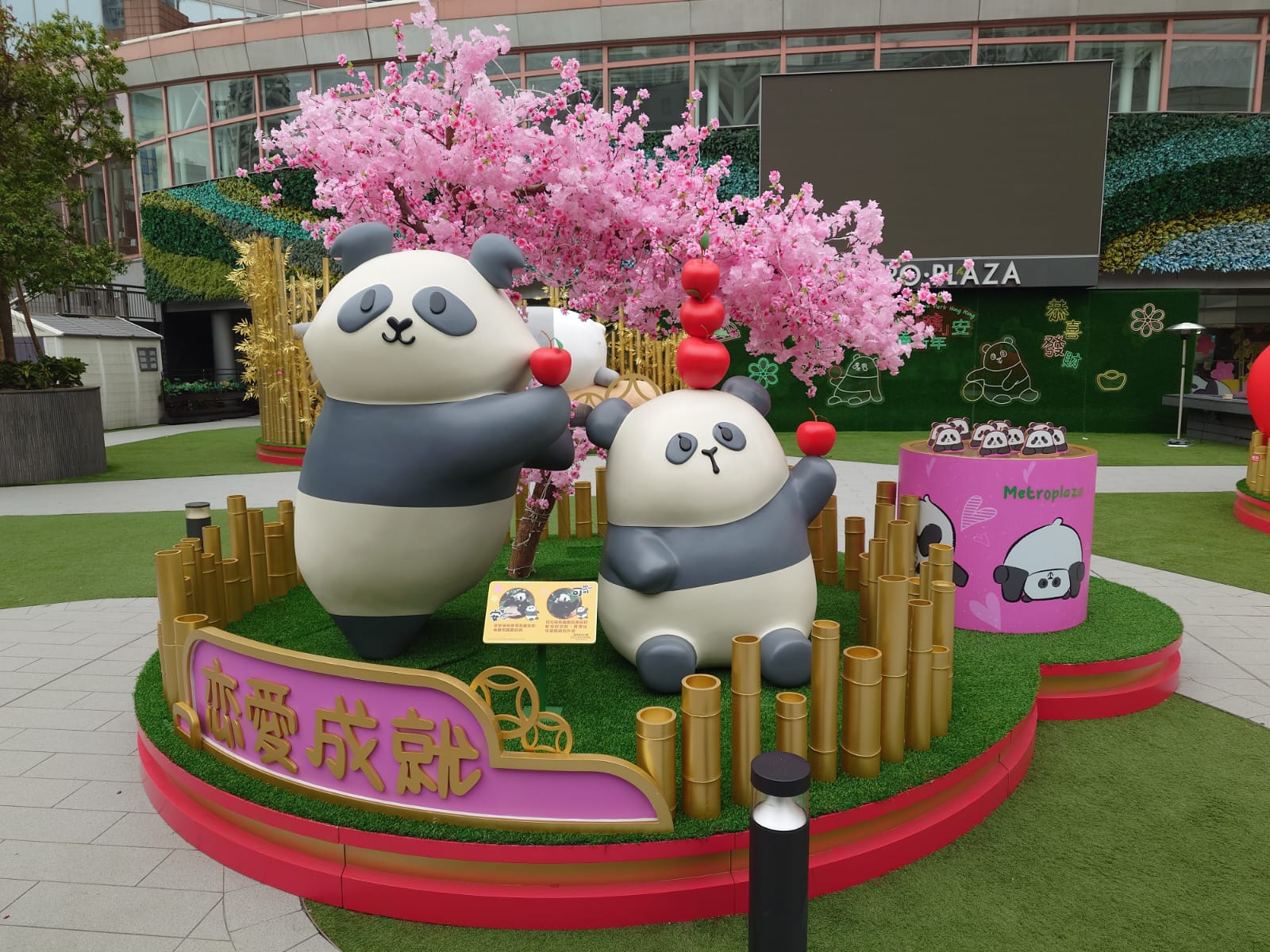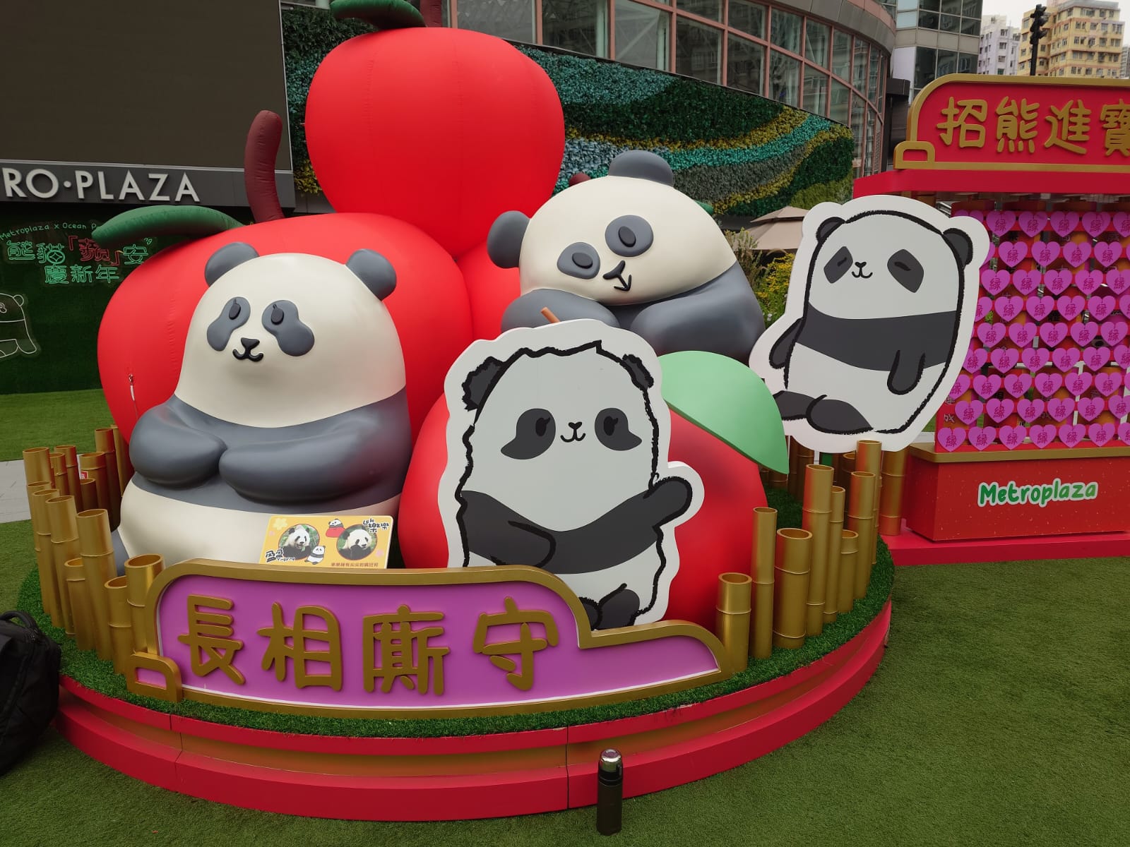 - 緣份吉祥竹林:為食的「盈盈」、「樂樂」於蘋果堆中嬉戲玩耍,亦不忘與龍鳳胎寶寶一家四口歡迎大家,你亦可在緣份吉祥竹林前誠心許願,祈求緣份到來!