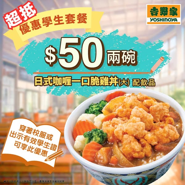 【$ 50雙人學生套餐,超抵優惠又殺到!】Hey同學仔!又到咗你哋最期待嘅學生優惠時間喇!只要穿著整齊校服或出示有效學生證,嚟指定分店就可以享受超抵學生專屬優惠!真係超抵,唔好錯過呀! $50雙人學生套餐:• 兩碗日式咖喱一口脆雞丼(大)配飲品*香濃日式咖喱、脆雞一口接一口,食完仲想再Encore! 優惠日期:星期一至星期二限定 適用分店:全線分店(西灣河太安樓、灣仔台山中心、中環大昌大廈、香港仔湖南街、九龍灣MegaBox、大埔寶鄉街、港鐵上水站及屯門時代廣場分店除外)*圖片只供參考 | 只限指定分店供應 | 優惠須受條款及細則約束 | 學生優惠只適用於收銀處付款