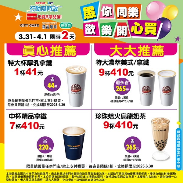 3/31~4/1 限時2天 多款指定飲品優惠.