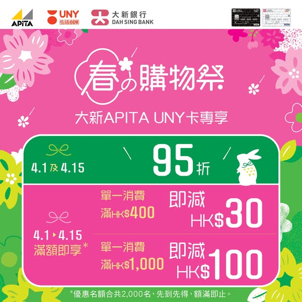 【#UNY春の購物祭 大新APITA UNY卡專享高達$100折扣,指定日子再享折上折!】由即日至4月15日,顧客凡於APITA及UNY憑大新APITA UNY卡消費,單一消費滿$400或以上,即減$30;單一消費滿$1,000,更可減高達$100!另外,於4月1日及15日憑大新APITA UNY卡消費,可享恆常95折優惠,多重獎賞,絕對係入手春季好物嘅好機會!更多優惠詳情及條款: https://bit.ly/3Xu9AyP借定唔借?還得到先好借!本文提及的服務/產品並不是以歐盟的人士為目標。—一APP盡享會員儲分、獎賞兌換及網購體驗, 立即下載CU APP:https://bmai.cc/4p7cku