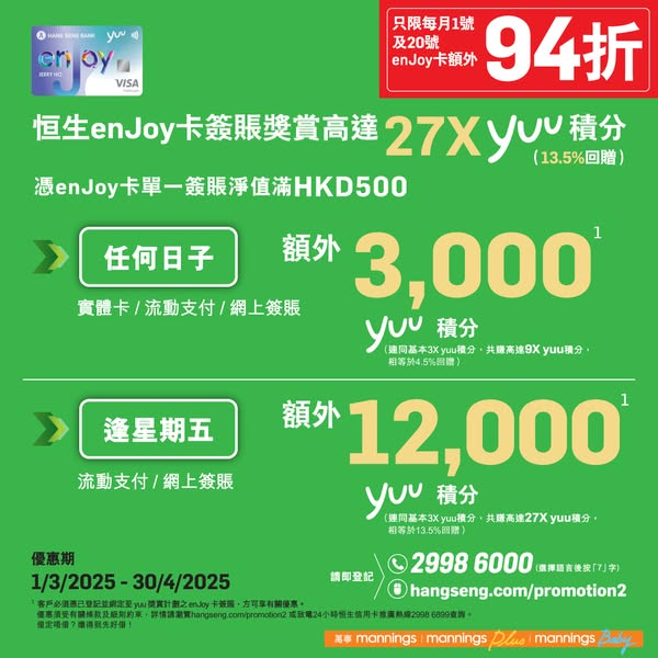 想購買更多激抵貨品?即刻去萬寧官方網店啦~:https://bit.ly/3F989iY由即日起至4月30日,只要你憑已登記並綁定至yuu獎賞計劃嘅恒生enJoy卡