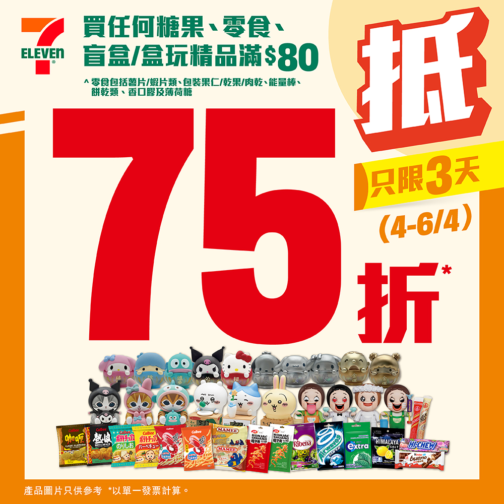 今個兒童節7-Eleven為大家炮製特別驚喜,帶來激抵優惠:只要於4月4日至4月6日到任何一間7-Eleven或7-Eleven App購買任何糖果、零食^、盲盒/盒玩精品滿 $80或以上,即享75折激抵優惠*,讓顧客掃盡心水筍貨!
