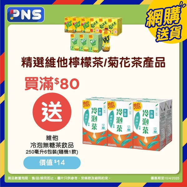買精選維他檸檬茶/菊花茶產品滿$80,送維他冷泡無糖茶飲品250毫升 x 6包裝 (隨機一款)
