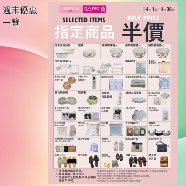 以上推廣優惠期:即日起至4月30日* 以上所有優惠受有關條款及細則約束,詳情請參閱宣傳海報或向店舖職員查詢。