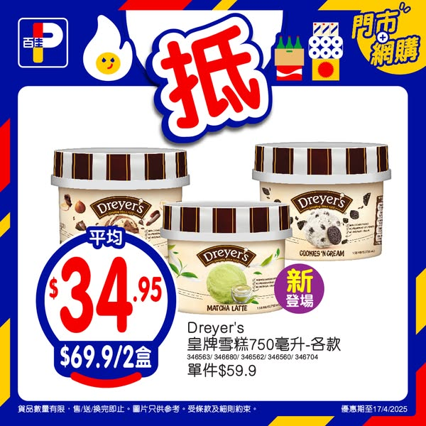 Dreyer’s皇牌雪糕750毫升-各款 $69.9/2盒 (平均$34.95/盒)*