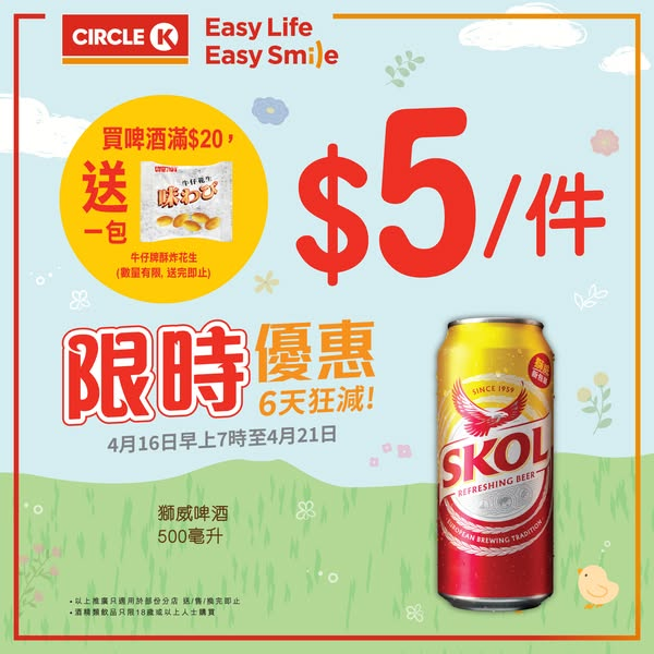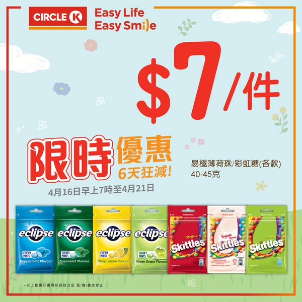 【6天狂減】限時優惠 今期限時優惠Circle K為你送上易極薄荷珠/彩虹糖超筍優惠! 每件都係$7! 同期仲有多款啤酒、雪糕、飲品推出限時優惠!快啲嚟掃貨啦! 雀巢Oreo & KitKat & 雀巢咖啡雪糕批 (各款)$60/5件【平均每件只係$12】其他優惠 :三得利伊右衛門綠茶600毫升$15/2件易極薄荷珠45克/彩虹糖40-45克(各款) $7/件獅威500毫升 $5/件推廣日期: 由2025年4月16上7時至4月21日