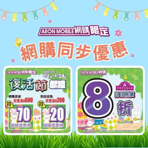*只適用於AEON Mobile網購。以上優惠恕不可與AEON DAY同時使用。優惠受有關細則及條款約束。
