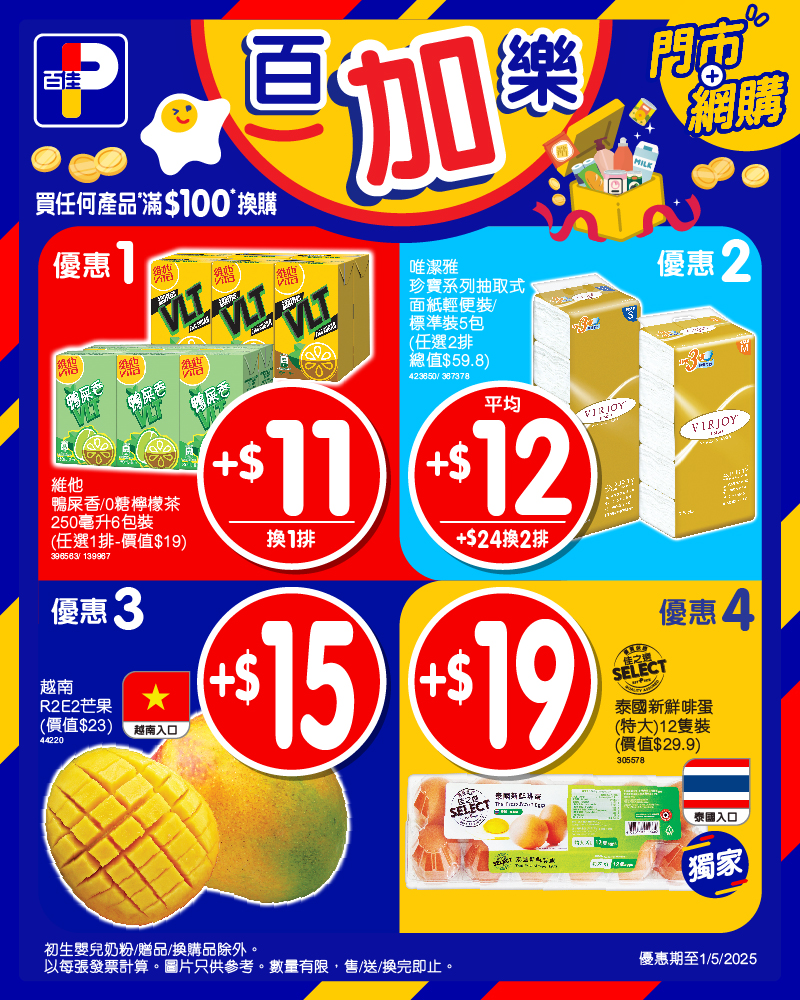 *優惠期至1/5/2025。以上優惠適用於大部分香港百佳、FUSION、TASTE、INTERNATIONAL及PNS網購有售,並不適用於百佳旗下的其他超市品牌、數碼港商場3樓及新鮮食品優惠並不適用於TASTE x FRESH 新鮮生活之店舖。貨品數量有限,售/送/換完即止。圖片只供參考。受條款及細則約束。# 初生嬰兒奶粉/贈品/換購品除外。