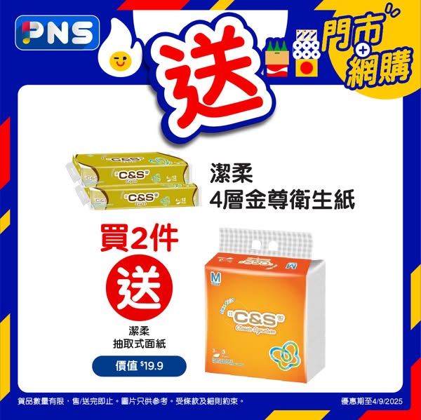 買2件潔柔4層金尊衛生紙,送潔柔抽取式面紙(價值$19.9)
