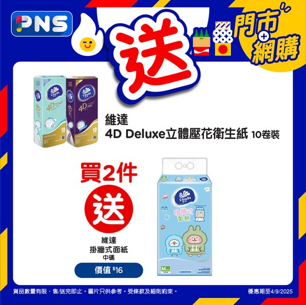 買2件維達4D Deluxe立體壓花衛生紙10卷裝,送維達掛牆式面紙中碼(價值$16)