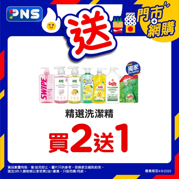 精選洗潔精買2送1(*請加3件入購物車以享優惠)優惠期至2025年9月4日。優惠適用於有售賣此貨品之香港百佳店舖及PNS網購。需登入PNS網購以查看贈品優惠。贈品數量有限,送完即止。優惠以每張訂單計算。圖片只供參考。受條款及細則約束。