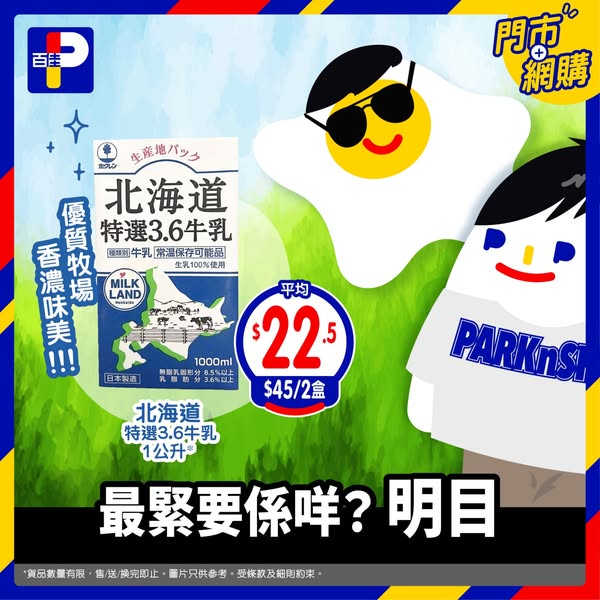 北海道特選3.6牛乳 1公升 $45/2盒 ; 平均 $22.5/盒牛奶控必試,乳脂肪佔牛奶成分嘅3.6%或以上,味道更香濃。