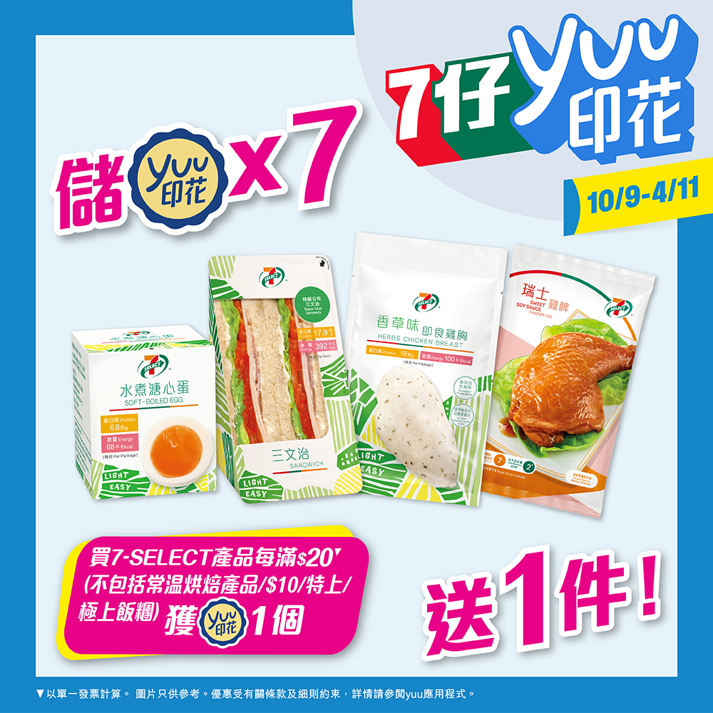 買7-SELECT產品每滿$20▾(不包括常温烘焙產品/ $10/特上/極上飯糰),即享7仔yuu印花 1個