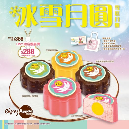 /由即日起至9月30日,凡於UNY樂富店阿波羅專櫃購買「冰雪月圓雪糕月餅」套裝,可享優惠價$288/盒(原價:$368/盒),每個套裝更加送免費鮮果乳酪券1張、雪糕蛋糕$30現金券1張及保溫冰袋1個。